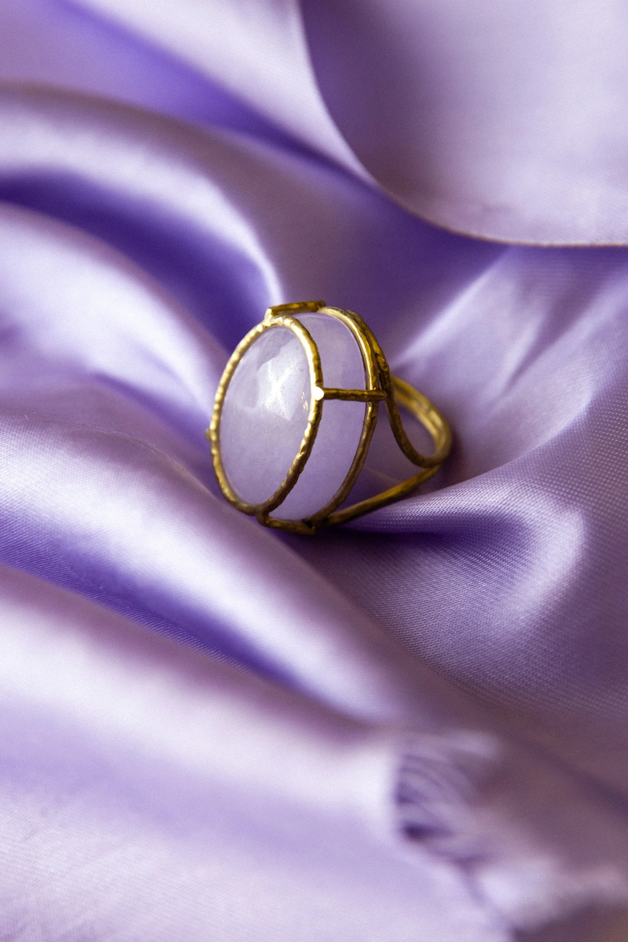 Anello SferaAnello in Oro giallo 18k con incastonata una Giada lavanda naturale. Unico esemplare. Maggiori informazioni